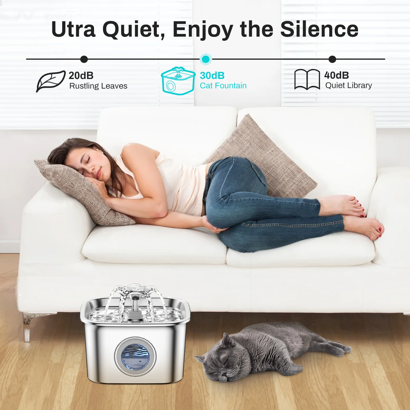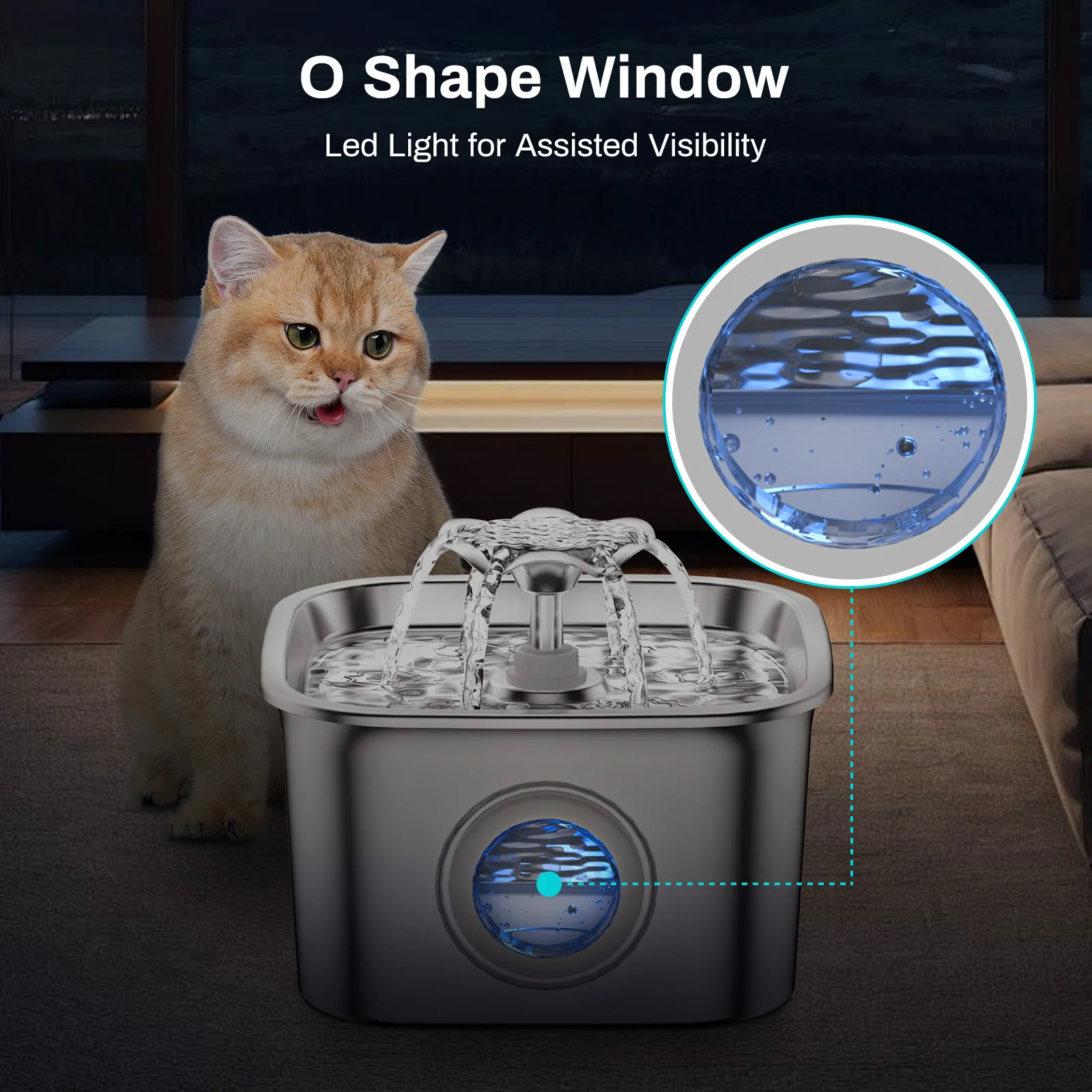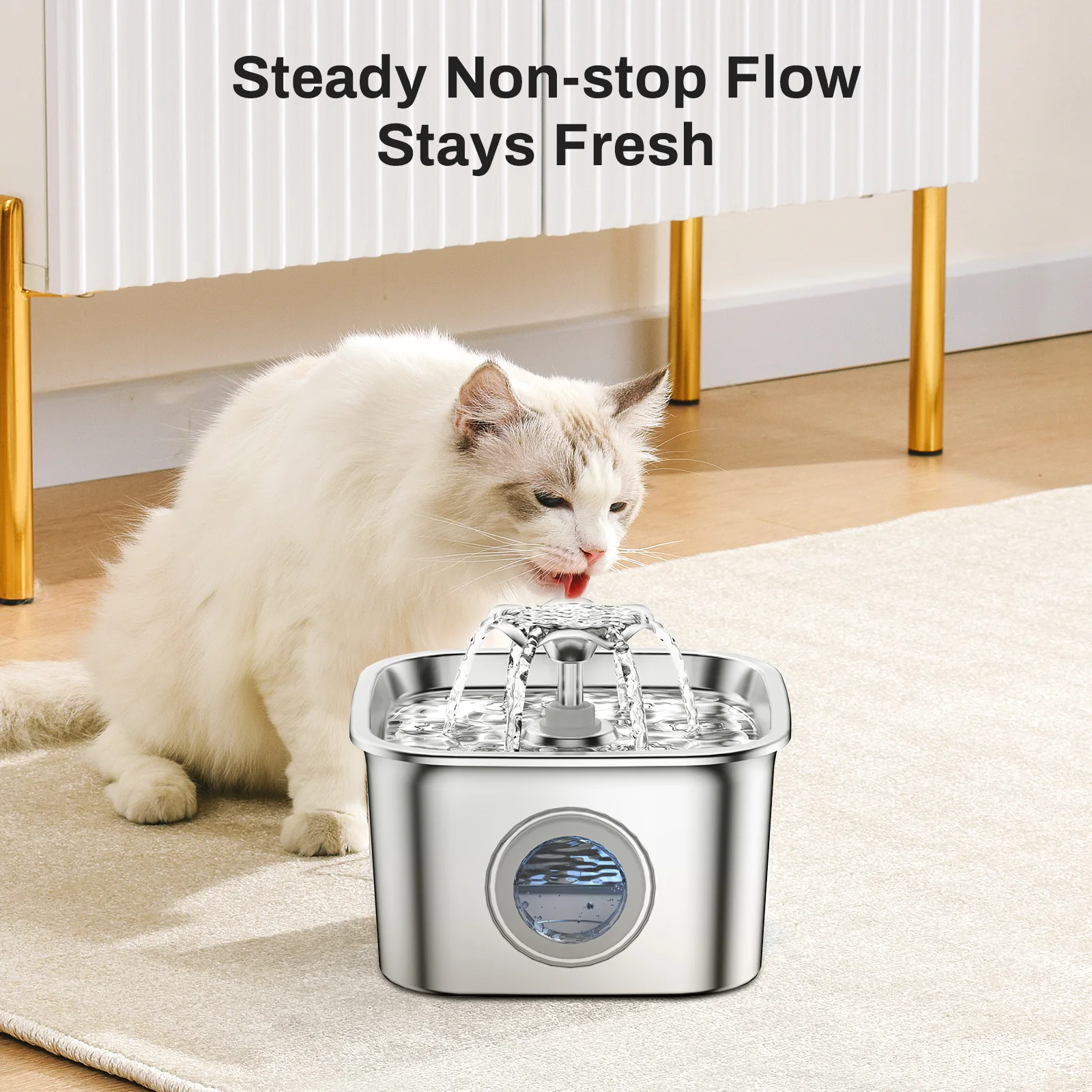 2.6L Automatic Cat Water Fountain Stainless Steel Pet Water Feeder Dog Water Fountain with window 2 Flow Mode (No 5V 1A Plug)