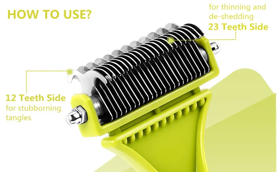 -Use the 23-tooth side in the same method for de-shedding and thinning. Always gently follow the direction of hair growth for your pet’s comfort.