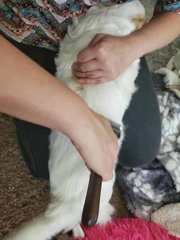 This dog grooming brush is amazing!! It works so well to remove the under coat. I have two dogs, and they are both shedding like crazy. This brush will help a lot with that, and they both thoroughly enjoy the process. They have very different hair types. One has short, very thick hair. The other has long, incredibly soft and fine fur. It works well for both, but definitely works best for longer fur. In fact it works better than any brush I’ve used on the long haired chihuahua featured in my pictures. It’s very effective, yet gentle, and she didn’t mind at all. The handle is well made, and the item is very high quality in terms of craftsmanship. I highly recommend this brush!