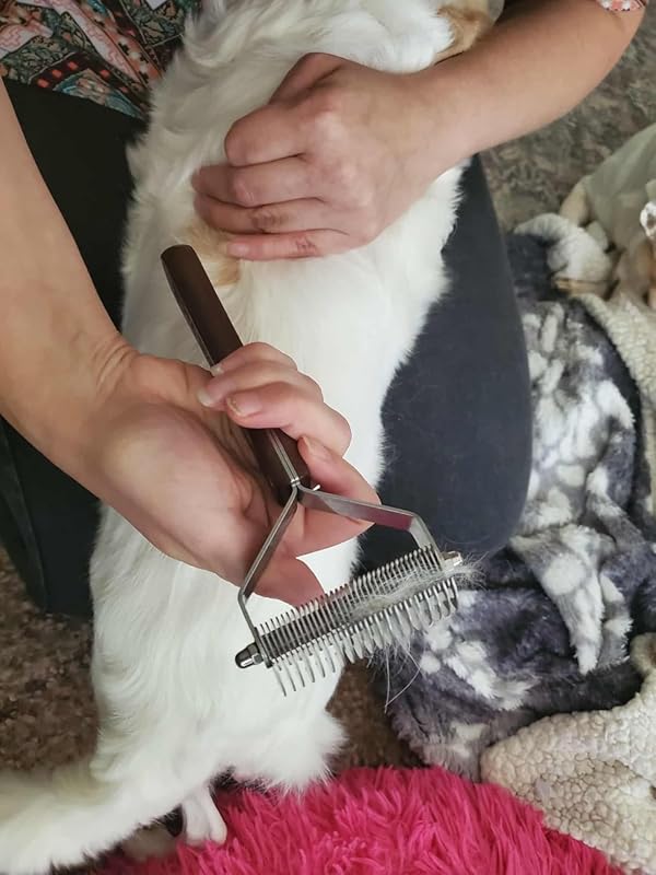 I have 2 small shih tzu pups who are matted in spots like crazy. Long hair is a nightmare like crazy! I have tried a variety of different types of combing brushes, but nothing works as good as this one. It is very easy to use with its two prong approach on either side. I am amazed at the amount of hair that is removed from their undercoat. It is great at getting the mats out with the fine tooth comb side and de-shedding them with the larger comb side. The brush quality is great. The design of the wooden handle adds a nice touch for ease of use and the grip is great on it. it works well at getting out their tangles.