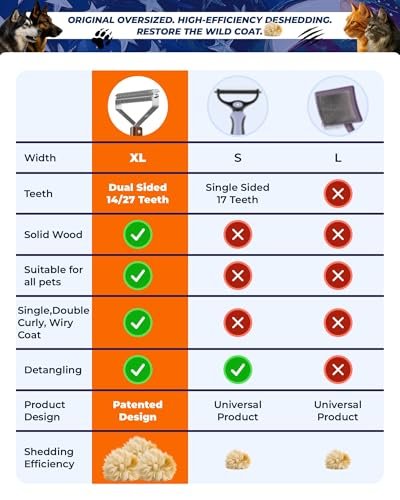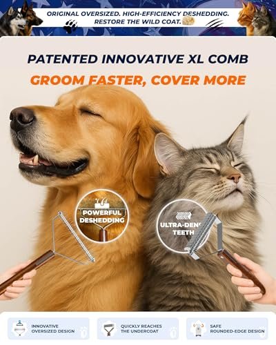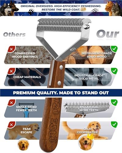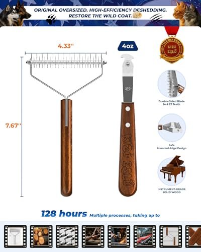 About this item ✂️【Effortless Mat and Tangle Removal】Easily remove stubborn mats and tangles with KIZO ESLO️ professional-grade extra larger dematting comb. Designed for both cats and dogs of medium or long coat length, like German Shepherd, Husky, Bernese Mountain Dog, this professional grooming tool ensures a smooth, pain-free grooming experience, leaving your pet’s coat healthy and neat. ☀️【Reduce Shedding Significantly】KIZO ESLO️ double-sided shedding tool quickly demat and detangle pet undercoat rake and effectively reduces shedding by up to 97.9%, keeping your home cleaner and your pet’s coat in excellent condition. Perfect for use during shedding season. 😄【Safe and Comfortable Design】With rounded stainless steel teeth, this double side coat rake deshedding brush gently glides through your pet’s fur without pulling or causing discomfort. Ensure a safe and pleasant grooming session every time. ⏰【Quick and Efficient Grooming】Save time with our versatile grooming tool. The dual-sided design features a wide-tooth side for tackling tough mats and a fine-tooth side for deshedding and thinning, making grooming faster and easier. 🪵【Ergonomic Handle for Comfort】The handle of this pet hair brush comb is made of high-grade sapele logs from lumber, providing a comfortable and secure grip. Minimize hand fatigue and groom your pet with ease, ensuring a stress-free experience for both you and your pet. 🌹【Lifetime Warranty Guarantee】Shop with confidence knowing that our pet brush comb comes with a LIFETIME WARRANTY. If you encounter any issues, KIZO ESLO️ offer a full replacement or refund. Your satisfaction is our top priority, ensuring you and your pet enjoy a superior grooming experience. Give it a try for your pet!