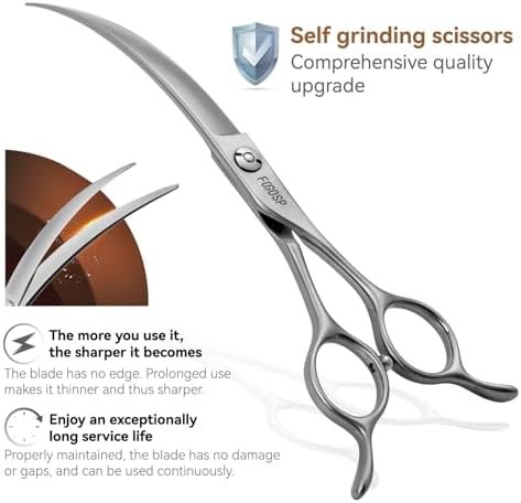 About this item 🌈[Professional dog grooming scissors] FOGOSP king series curved scissors is designed for groomer with heavy daily grooming work. 45 degree large arc curved shears can more efficiently trim the perfect arc effect. Greatly reduce your grooming work intensity. 🌈[One Good Shears better than Four Poor Shears] This curved dog grooming scissors made of Japanese VG10 high-carbon steel. 63HRC, the hardness is higher than common pet grooming scissors on the market. Steel hardness determines the durability of the scissors, high hardness, good durability, long service life. Yes, One good grooming shears better than four poor shears. 🌈[Precision Manufacturing] The curved scissors for dog grooming used Japan’s advanced cryogenic quenching technology. Make scissors steel with high density, high hardness and good wear resistance. The cutter head is formed in one time by arc hydraulic pressure and manually adjusted by professional masters. 45 degree curved grooming shears, the presentation of excellent scissor technology. Every step of the intention, only to present you with better grooming shears. 🌈[Super Comfortable Hands Feeling] The curved scissors for dog grooming have high precision CNC screw, good stability smooth opening and closing, super light and smooth. Ergonomic grooming shears making them comfortable and lightweight to hold in your hand, effectively avoid wrist joint injury. Good Tools Make You Enjoy Your Work Even More. 🌈[100% Satisfaction] Each pair of dog trimming scissors for grooming , we go through more than 10 inspections processes to ensure that you get the more satisfactory scissors. If you have any question, please contact us. We offer 100% satisfaction or money back. Invest with no risk.