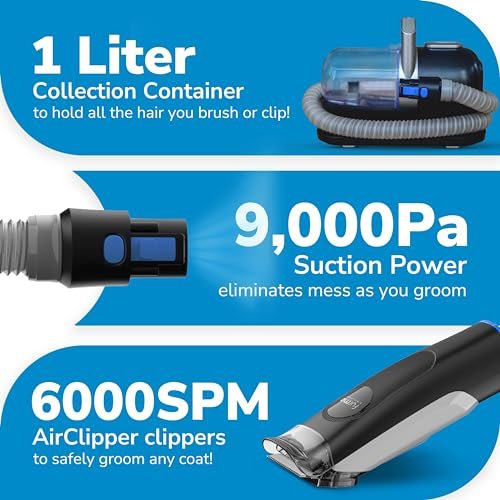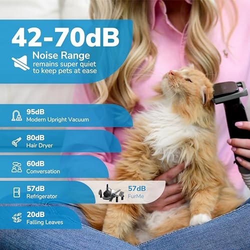 About this item COMPLETE GROOMING: The cat & dog vacuum grooming kit includes grooming tools like Grooming Brush, Electric Clippers, De-Shedding Tool, and two specialized cleaning tools, providing a complete grooming experience for both dogs and cats. MESS-FREE: With 9,000Pa suction power, the pet grooming vacuum captures 99% of cat & dog hair and dander, eliminating the need to clean up afterward. The 1-liter collection bin of pet vacuum holds all the pet hair for a mess-free grooming session. QUIET OPERATION: Designed with comfort in mind, cat & dog grooming kit operates quietly in the 42-70dB range, reducing vibrations to keep your pets calm during grooming. Our pet hair remover provides a gentle session for your furry friends. VERSATILE DESIGN: FurMe cat & dog grooming vacuum set adapts to all fur types. It’s the ideal grooming vacuum for both cats and dogs, ensuring a smooth experience for every coat and addressing shedding needs. USER-FRIENDLY: The pet grooming kit is easy to handle, safe to use, and makes pet grooming at home a smooth and quick task for both dogs and cats. It’s designed to handle all your pet’s grooming needs, from grooming to shedding.