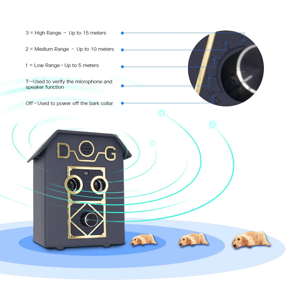 An Ultrasonic anti barking device with 3 distance level ranges up to 50Ft.