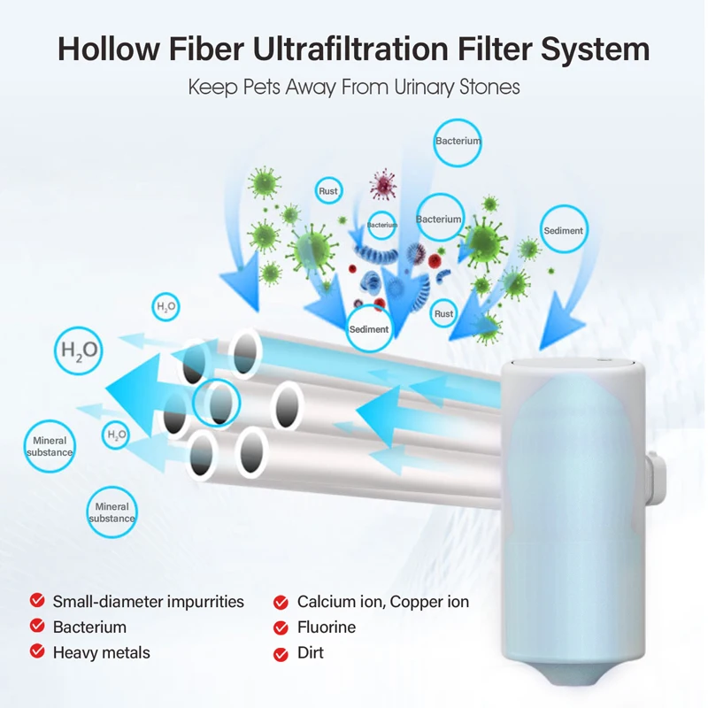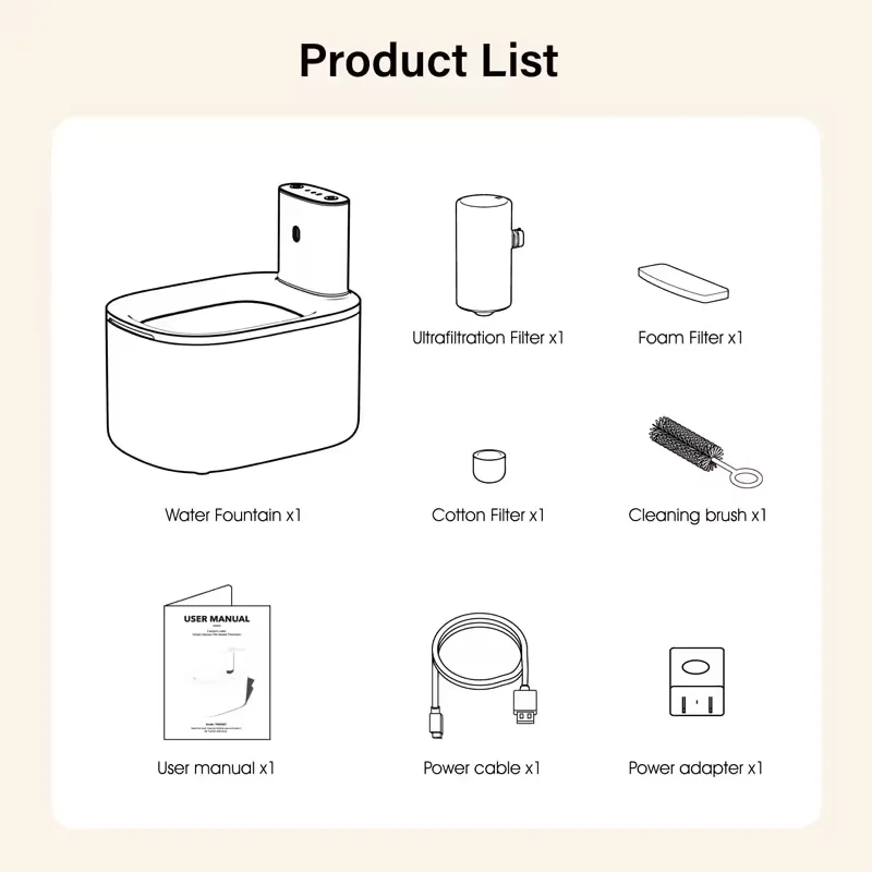 💧 Package contenrs:water fountain*1,ultra filtration Filter *1,Foam Filter *1,Cotton Filter *1,Cleaning Brush *1, Power Cable *1,Adapter *1, User Manual *1